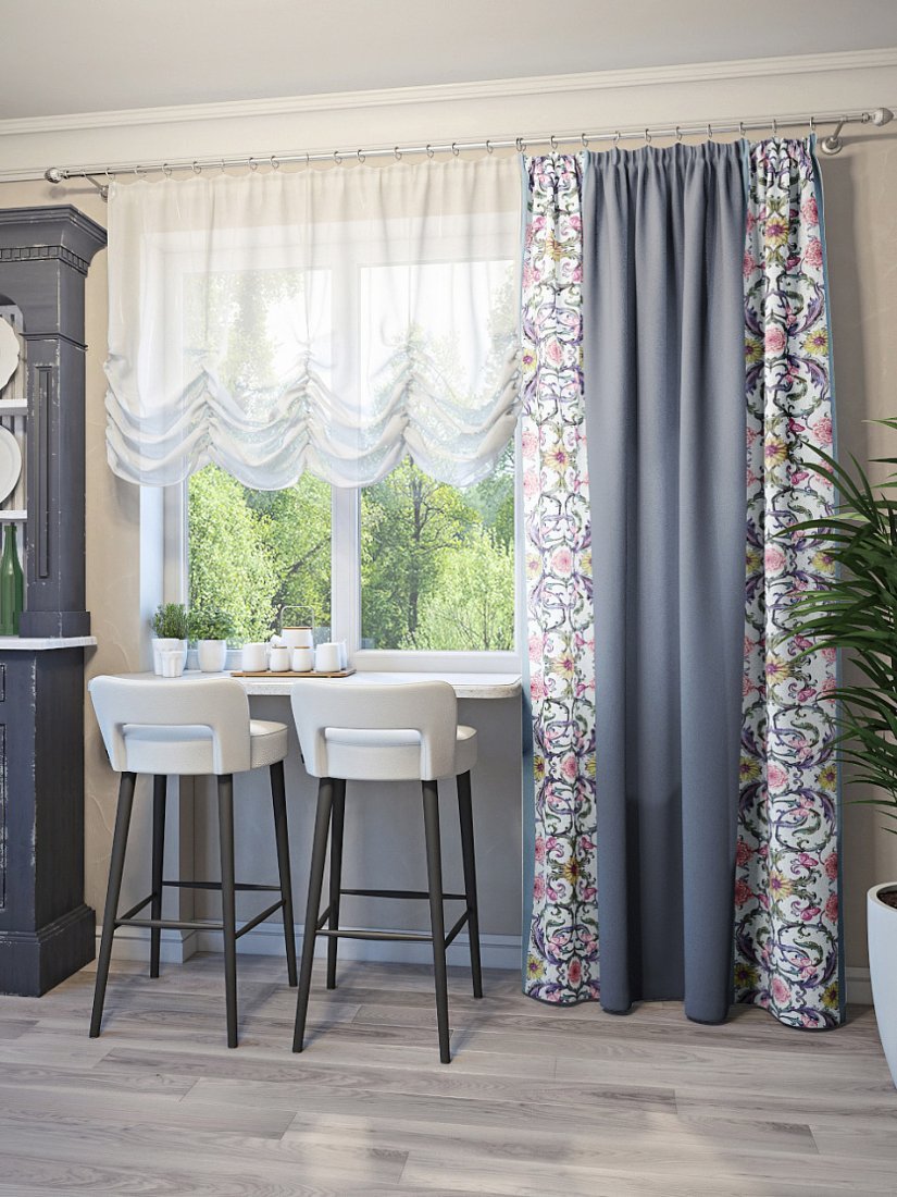 - Визуальный эффект. Горизонтальные принты на шторах расширяют комнату, а вертикальные — поднимают потолок.